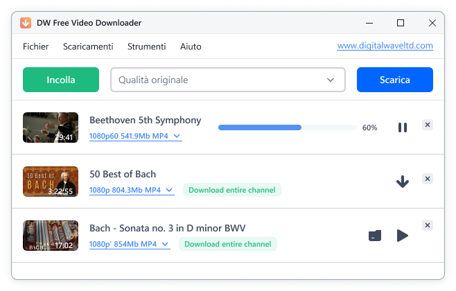 Salva i video di YouTube in HD o 4K, estrai l'audio MP3 e guardali offline in qualsiasi momento. Con DW Free Video Downloader, puoi scaricare intere playlist o singoli video con un solo clic: veloce, gratuito e sicuro.